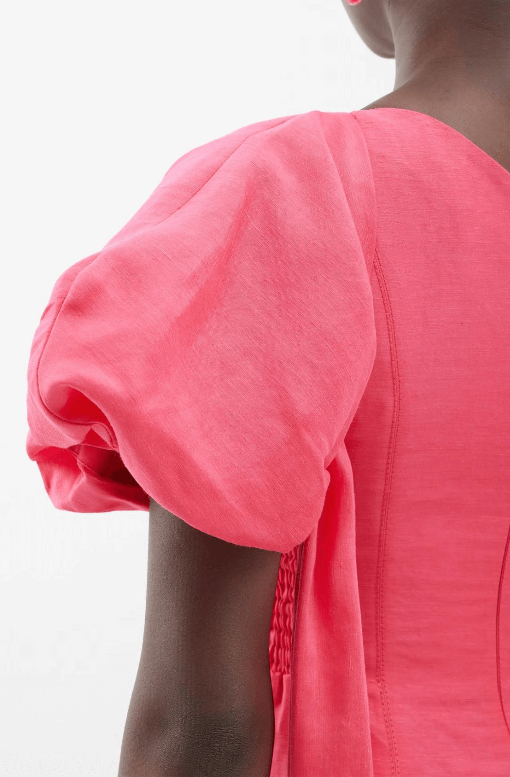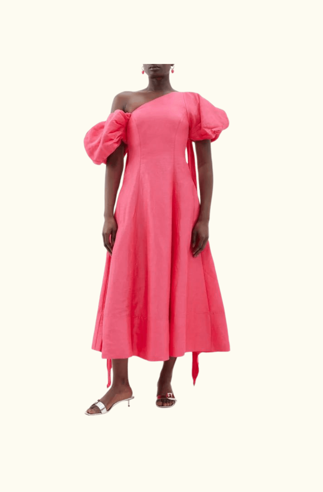 The Arista Tulip Sleeve Midi Dress by AJE is made to appear as one shoulder is slipping, the tulip-shaped sleeves are embellished with long, flowing ribbons that meet the midi-length hem.