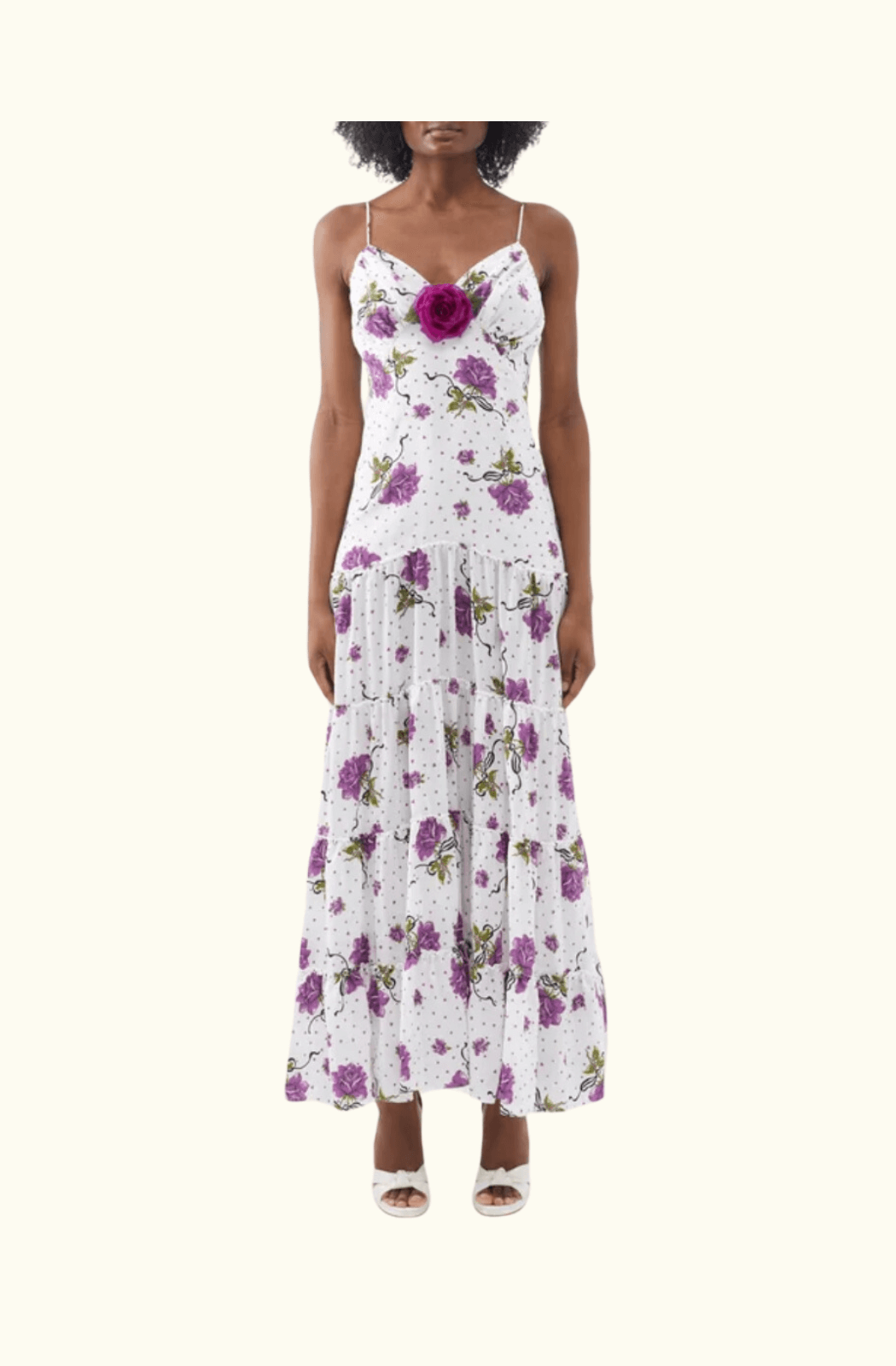 The Floral-Appliqué Printed Silk Slip Dress by Rodarte is cut from banded, rose-printed silk and finished with a blooming flower appliqué at the bust.